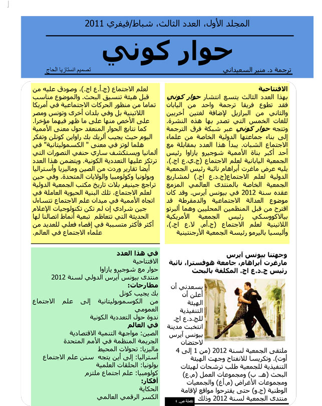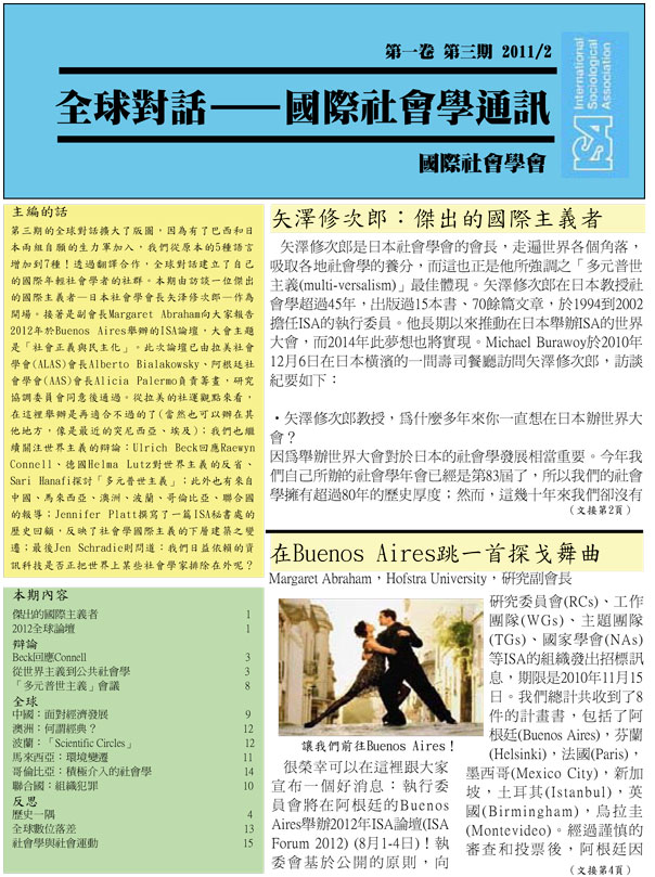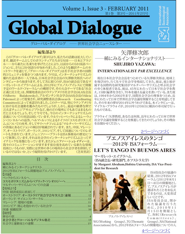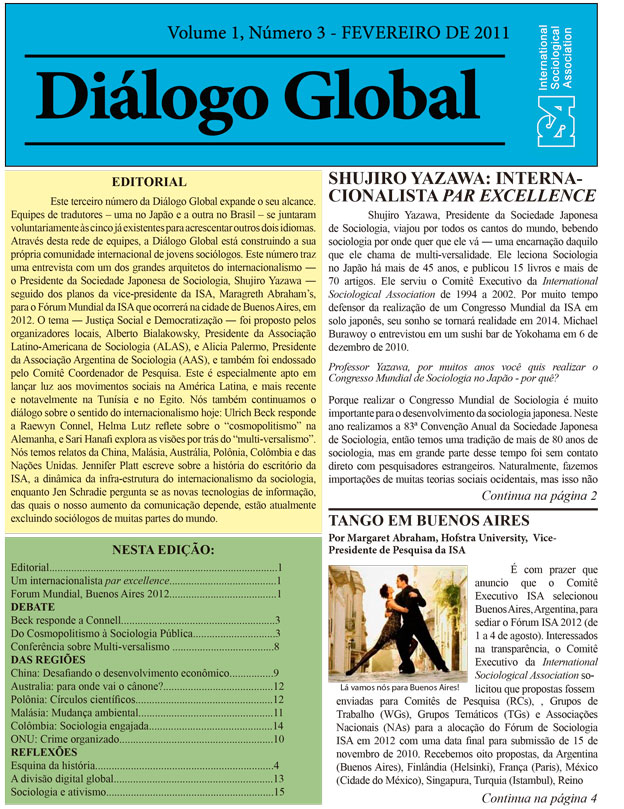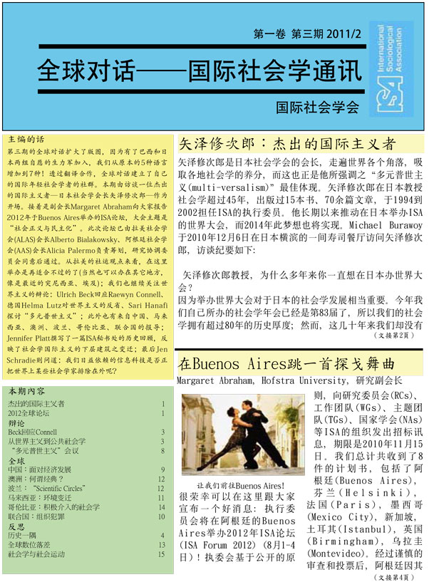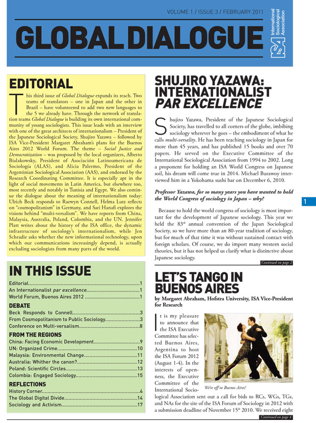 The selection of Buenos Aires as a venue for the ISA Forum in 2012 is an exciting first step, but there is much to be done in the year and a half ahead. I would also like to take this opportunity to thank all those who took time and effort to submit proposals that opened new possibilities for the ISA. I would also like to thank ISA President, Michael Burawoy, the Research Coordinating Committee, and the Executive Committee for working together to ensure a fair selection process. A big thank you to Izabela Barlinska whose office has been instrumental in helping to prepare the necessary documentation and for coordinating the responses to the call for proposals. The possibilities of the Forum can be immense. Its success will lie not only in developing an intellectually stimulating program but also, as an international body of social scientists, in working with policy makers, community activists, and the public to address the major issues of our time.