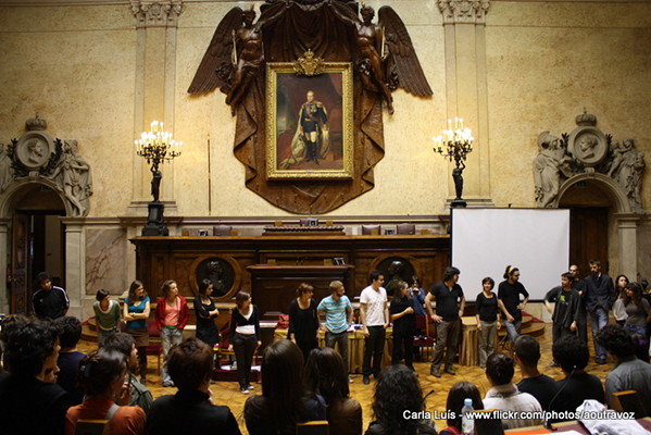 There we were in the middle of the Congress of the Portuguese Sociological Association, held in Porto in June (2012), putting on a “forum-theater” play, called Estudantes por Empréstimo (“Students for Loans” as opposed to “Loans for Students”, http://estudantesporemprestimo.wordpress.com/). It narrates a concrete story – a student who, having no scholarship, was forced to take out a bank loan in order to proceed with her studies. The play is a Theater of the Oppressed project that has been running for more than two years, performed in dozens of schools and colleges in Portugal, from north to south, with thousands of students taking part. Bills and petitions were made from it; debates and direct actions were inspired by it. Depicting the costs of education, the play dramatizes unequal access to higher education, cuts in public funding and the spread of bank loans to students, subjecting their future to the financial system.