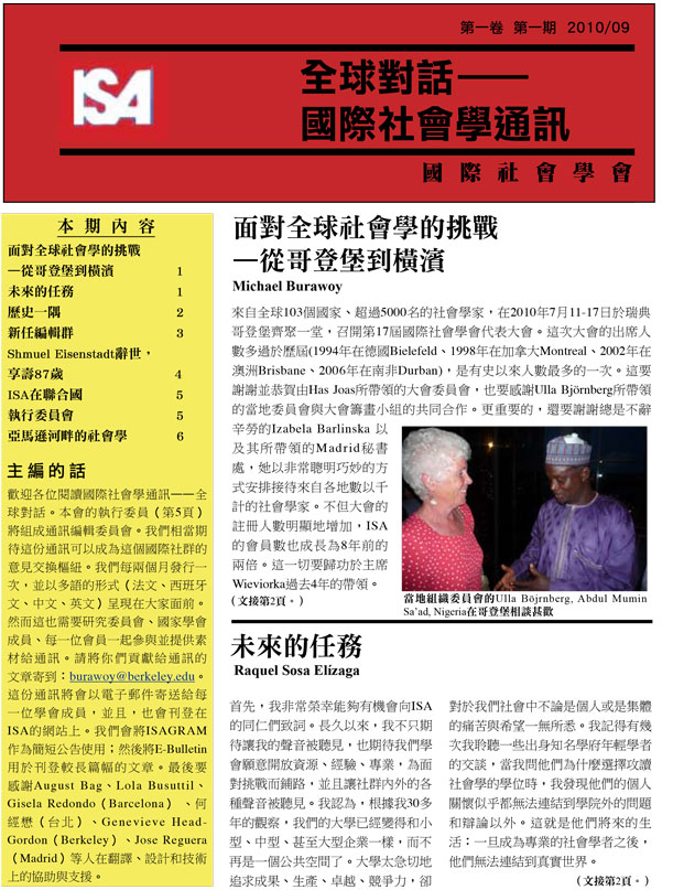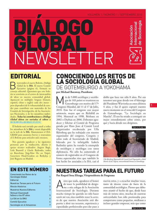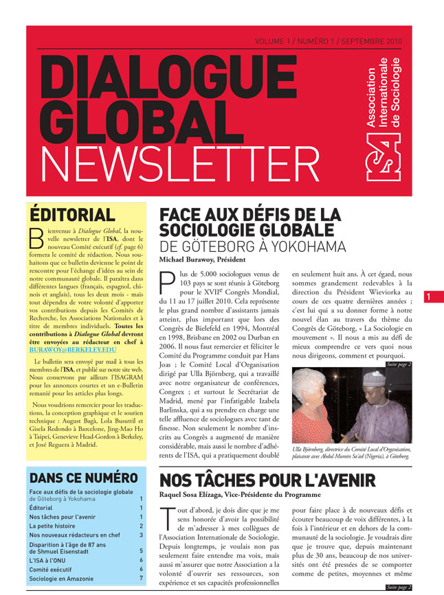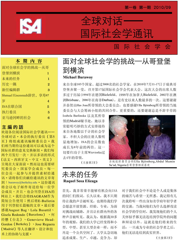 Several new editors have been appointed recently for ISA publications. They are Eloísa Martín (Current Sociology), Christine Inglis (International Sociology), Bert Klandermans (Sociopedia) and Sujata Patel (Current Sociology monographs and Sage Studies in International Sociology); we expect great things from all of them in their important tasks. Special thanks go to their retiring predecessors Julia Evetts, Melinda Mills and Dennis Smith for their valued contributions. Devorah Kalekin and Vineeta Sinha continue their sterling work on the International Sociology Review of Books and the E-Bulletin.