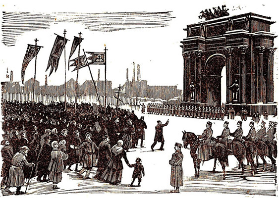 One of the largest and most intact constructivist projects still visible today is a complex of buildings in St. Petersburg’s (formerly Leningrad) Narvskaya Zastava district. A typical working-class suburb at the beginning of the twentieth century, Narvaskaya Zastava was the site of the tragic events of “Bloody Sunday,” when a peaceful workers’ demonstration was repressed by the Tsar’s Imperial Guard in 1905. After the Revolution of 1917, this event was canonized, and became a sacred marker of the new proletarian ideology (see Picture 1 above).